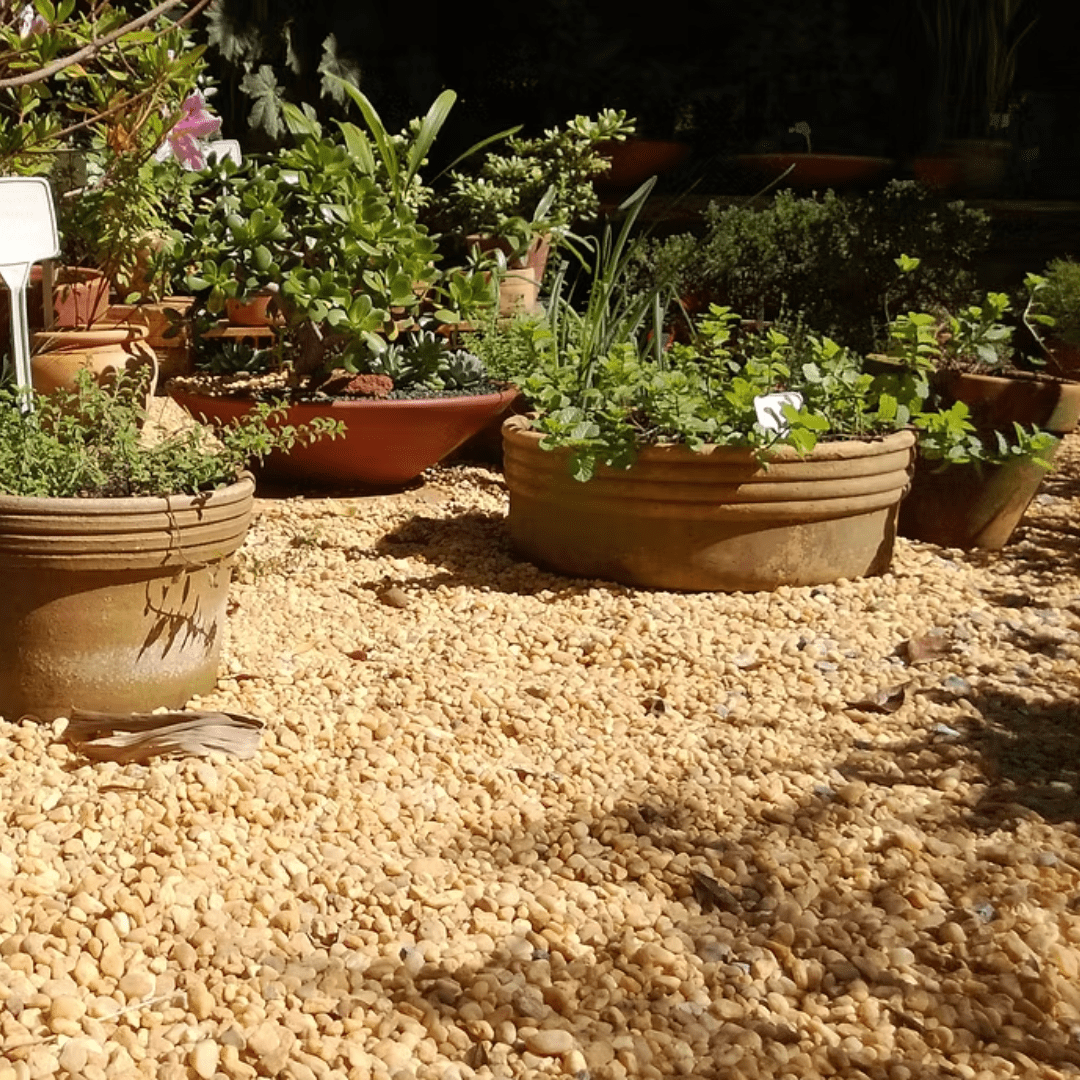 Forração de canteiros e caminhos. Mantém a umidade do solo e evita respingos de terra em paredes.